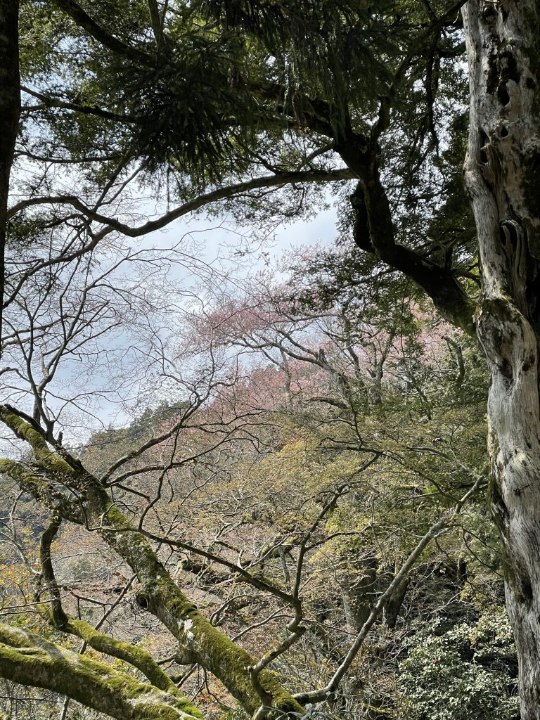 寺から1番近い山桜の老木の花が濃いピンクに色づき始めました